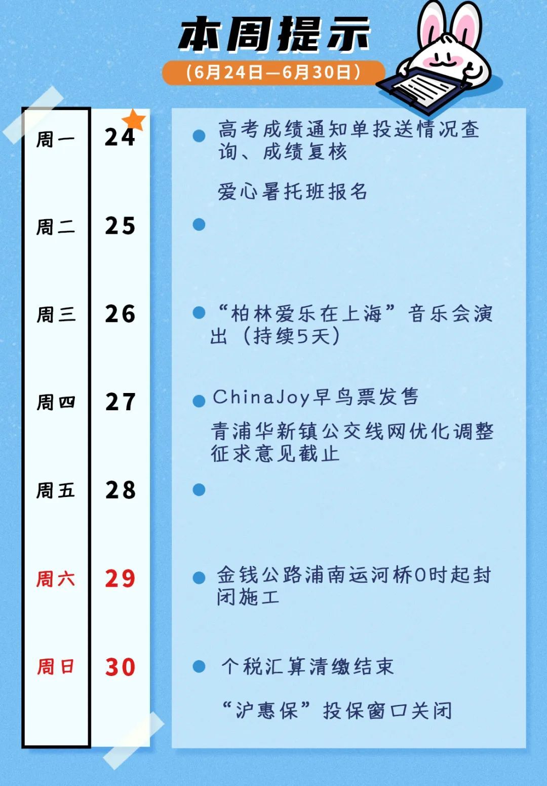 高考成绩通知单投送情况今天8:00起可查询、9:00至16:00可复核高考成绩,爱心暑托班今起报名,S20浦东段两个路段今起大修,ChinaJoy早鸟票周四发售,个税汇算清缴周日结束,“沪惠保”投保窗口周日24时关闭……本周还有哪些大事?速看本周提示↓