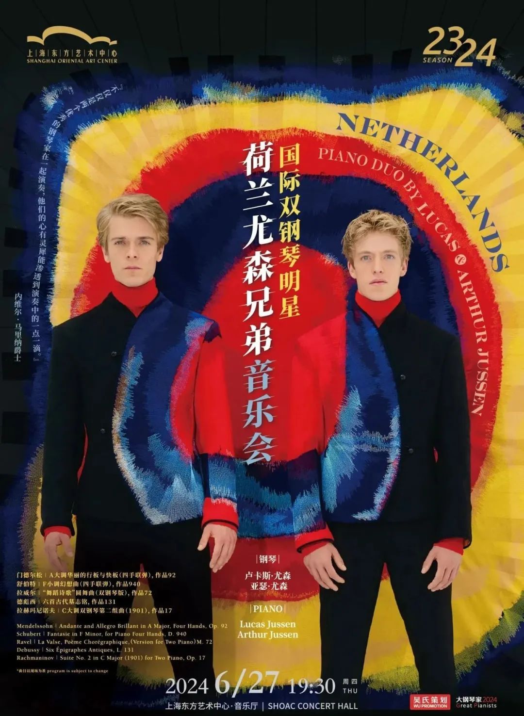 当今古典乐坛不可多得的双钢琴明星,荷兰尤森兄弟——卢卡斯·尤森 & 亚瑟·尤森,将再度登台东艺,以四手联弹与双钢琴形式,演绎门德尔松、舒伯特、拉威尔、德彪西与拉赫玛尼诺夫创作的浪漫主义经典,凭借极具层次感与表现力的演奏,展现越发拓宽和丰富的曲目,黑白键上再掀风暴。