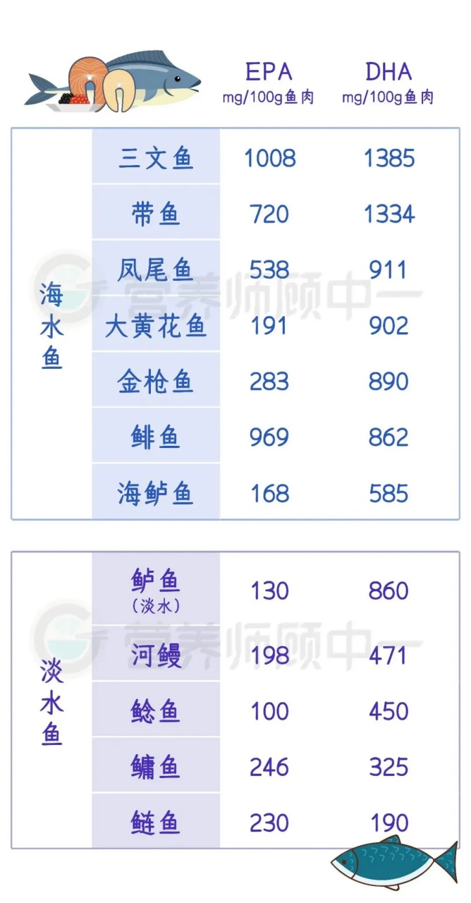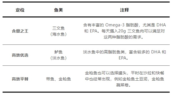 基于综合性的考虑,下面是几种常见的鱼品种,同样富含DHA和EPA,同时又能避免摄入高汞鱼类:三文鱼中 DHA 和 EPA 含量是最高的,每天食用 20g 就能满足人体需求,但是价格较高;鲈鱼,是淡水鱼中最合适的高脂肪鱼品种;带鱼和金枪鱼,则是海水鱼中的平价之选。
