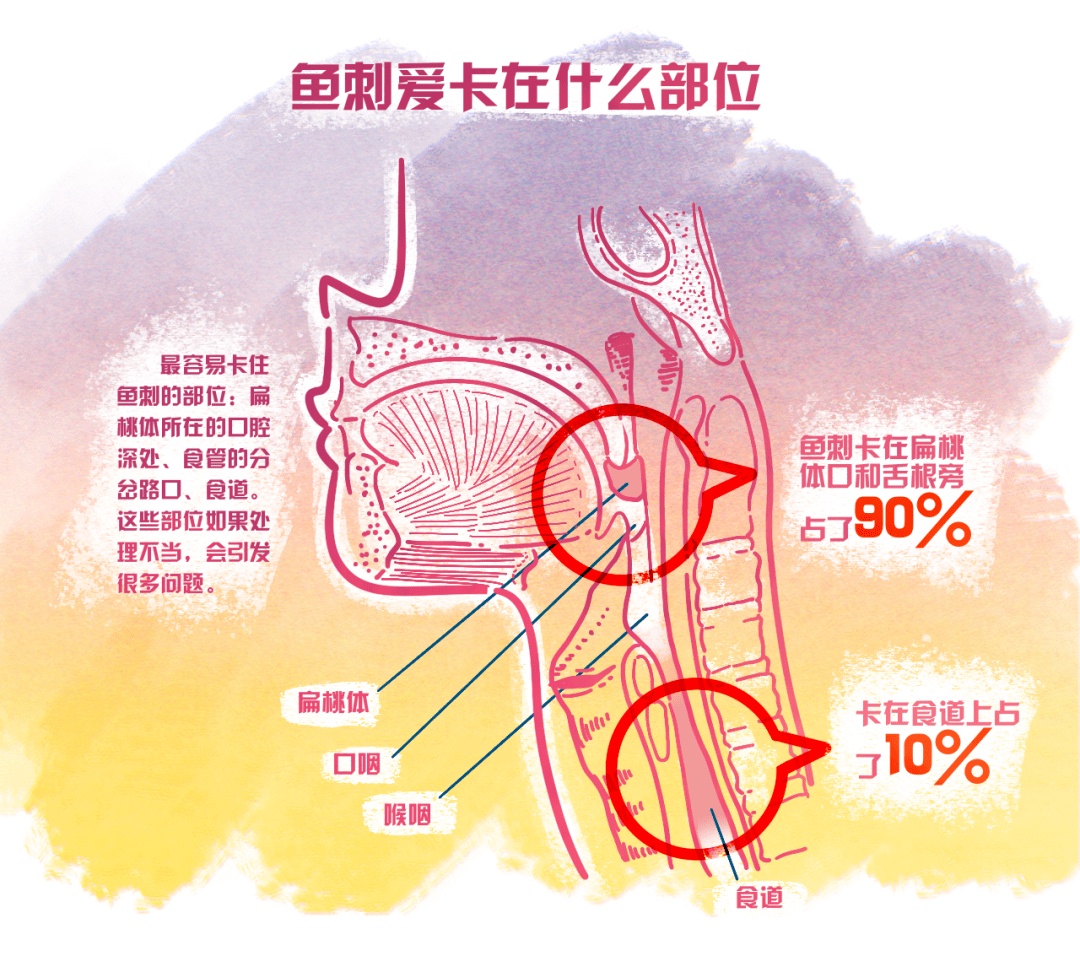 大部分鱼刺会卡在舌根部、扁桃体、会厌处。如不及时取出,可能会引起刺入部位感染,导致局部脓肿。