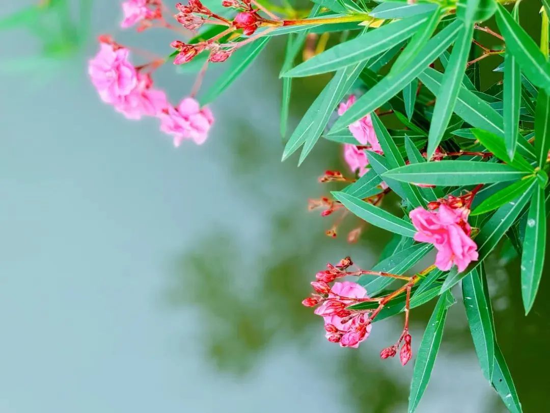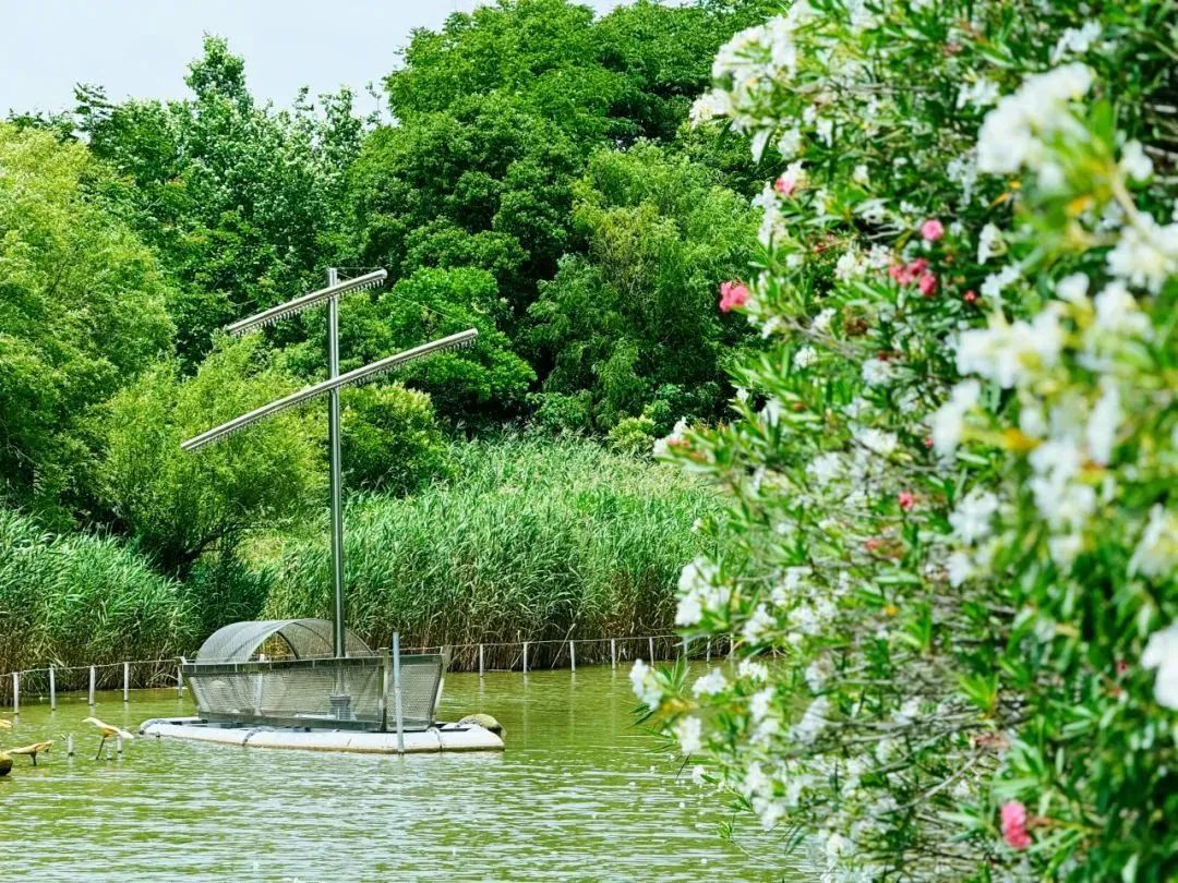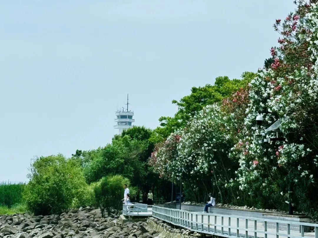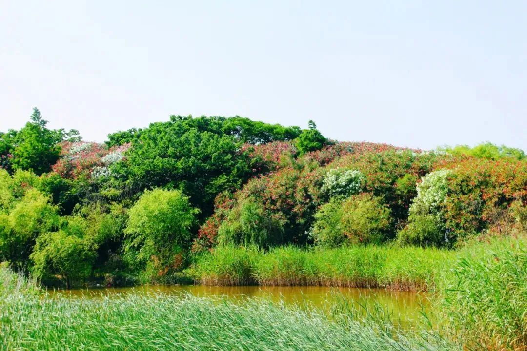 当下正是夹竹桃盛开的时候。栈道悠长,小桥纵横,林荫穿过,波痕点点,花开茂盛,这便是吴淞炮台湾国家湿地公园夹竹桃季最动人的美。