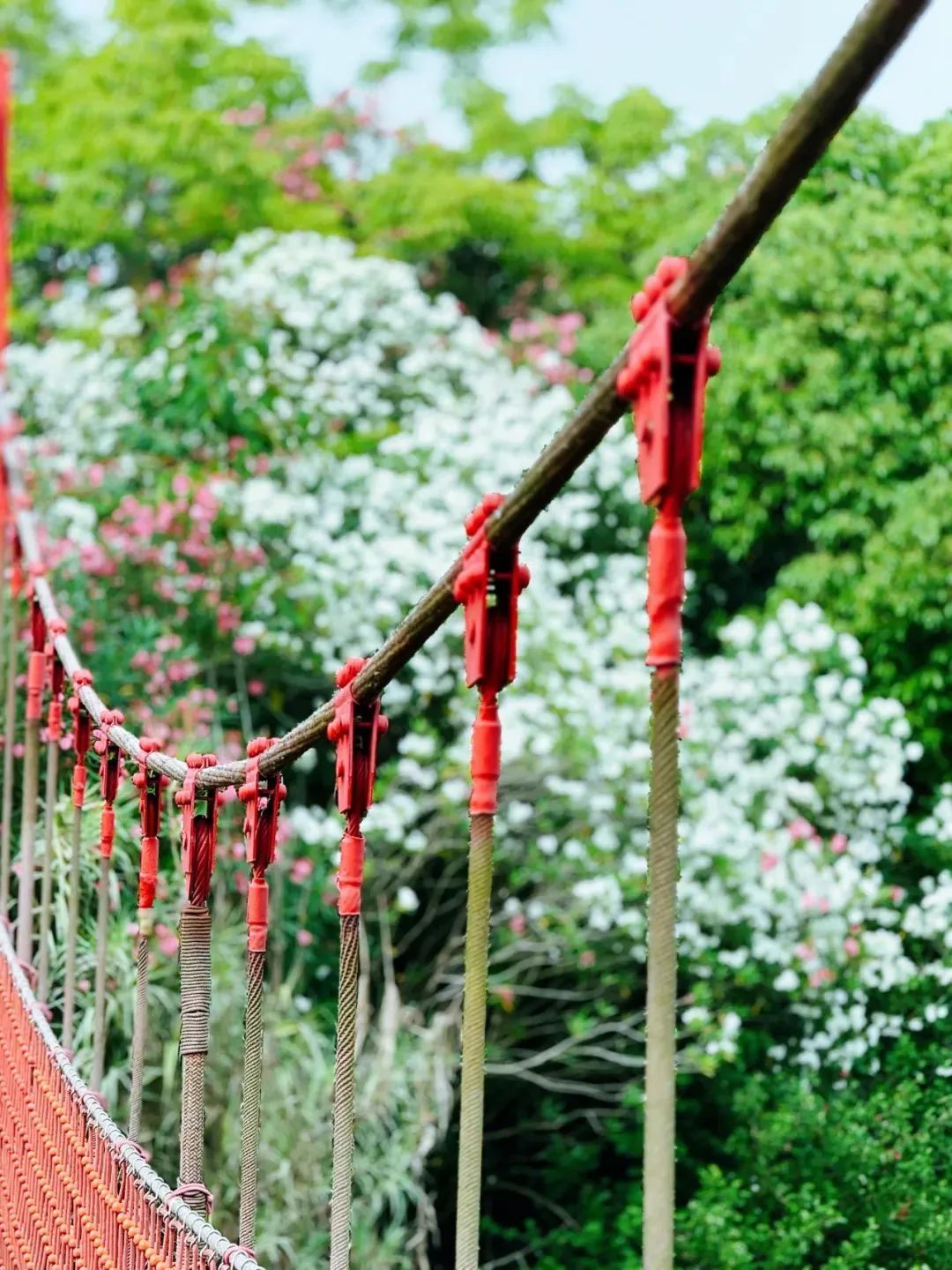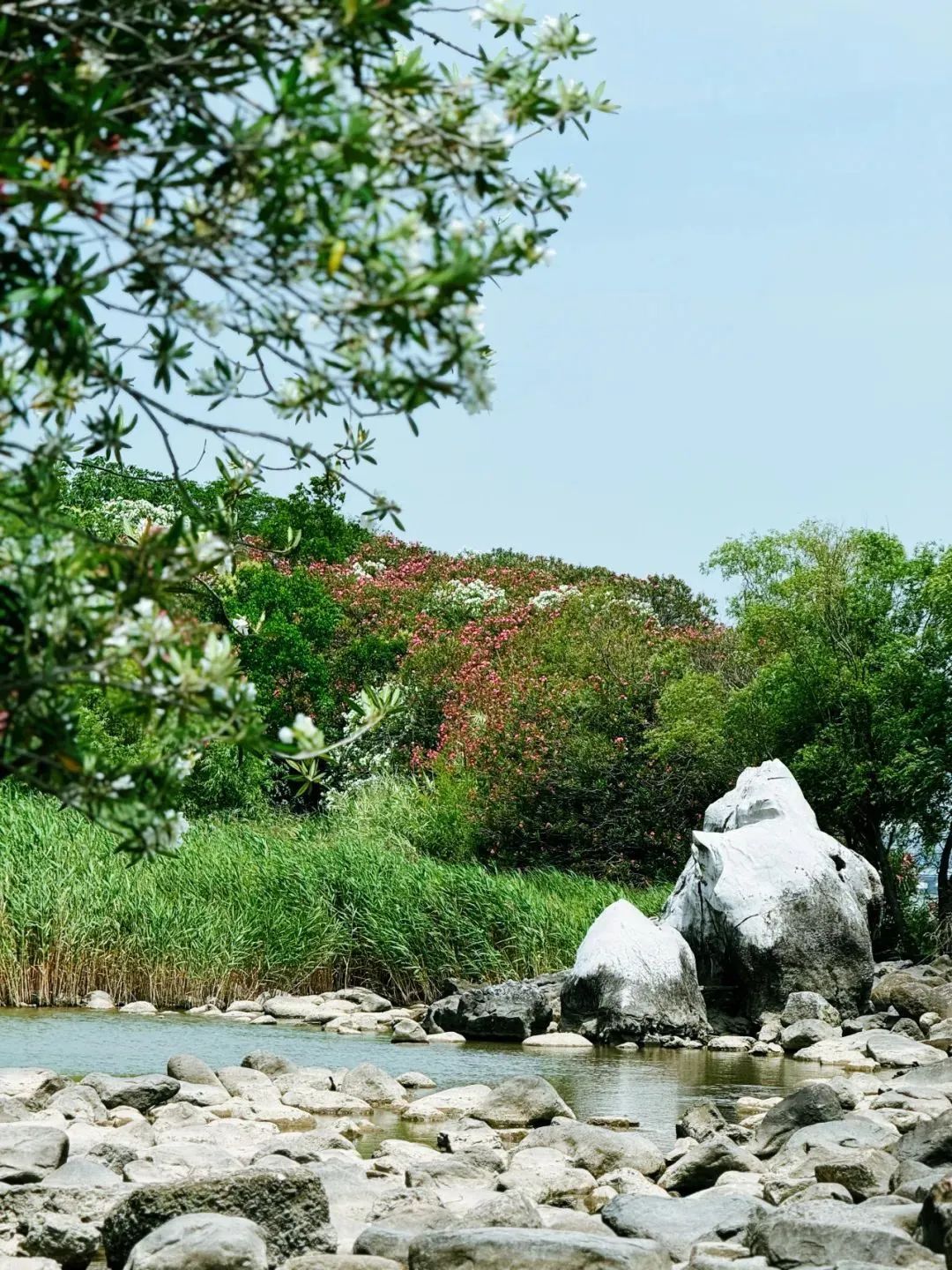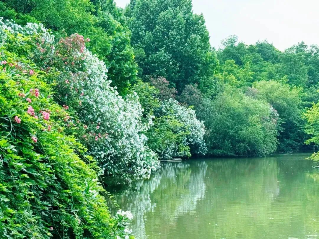 当下正是夹竹桃盛开的时候。栈道悠长,小桥纵横,林荫穿过,波痕点点,花开茂盛,这便是吴淞炮台湾国家湿地公园夹竹桃季最动人的美。