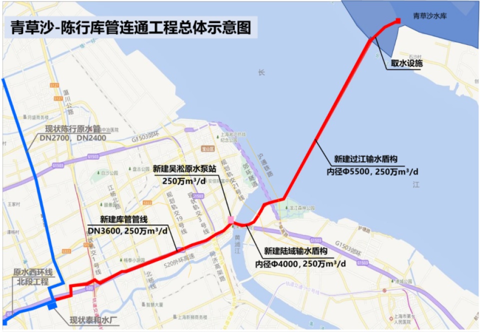 青草沙-陈行库管连通工程北起青草沙水库,南至泰和水厂附近原水西环线北段工程接管点,途经崇明区、浦东新区与宝山区。新建库管工程盾构内径4000-5500毫米,管道直径为3600毫米,全长约20千米,新建吴淞原水泵站设计规模为250万立方米/日。