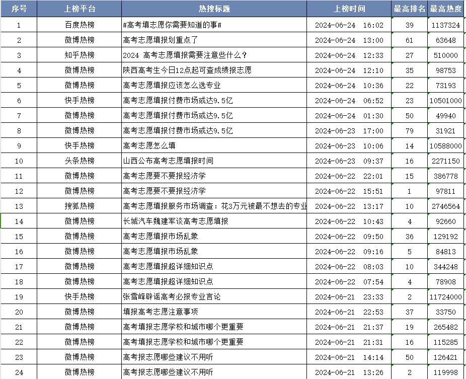 据齐鲁蛙眼舆情大数据平台显示,自高考结束后的6月11日至24日,关于高考志愿填报类话题的全网信息量约523万条,共形成98个相关热搜榜单。