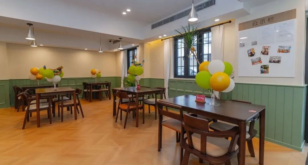 步入用餐区,仿佛穿梭进了老上海的怀旧时光。绿墙、原木地板与黑色窗框的搭配,让居民们在享受美食的同时,也能感受到海派文化的韵味。