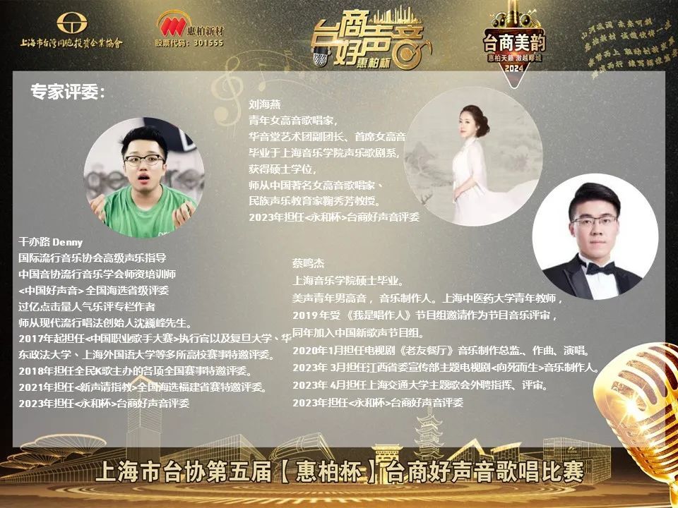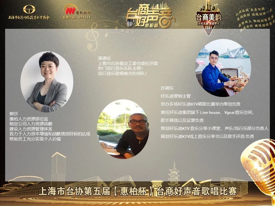 上海市台协第五届“惠柏杯”台商好声音歌唱比赛复赛即将打响,预祝各位会员朋友、台胞台商们在复赛中继续赛出水平、赛出风格、赛出友谊!