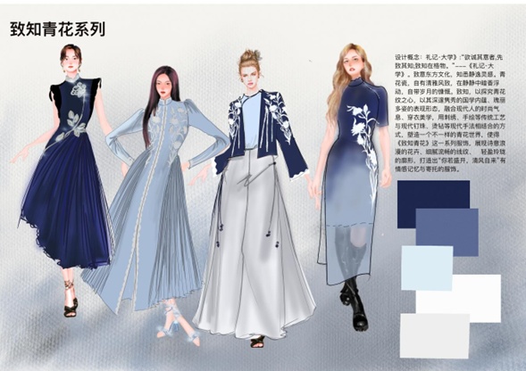 “欲诚其意者,先致其知;致知在格物。”(《礼记·大学》)。致意东方文化,知悉静逸灵感。青花瓷,自有清雅风致,在静静中暗香浮动,自带岁月的慷慨。致知,以探究青花纹之心,以其深邃隽秀的国学内蕴、瑰丽多姿的表现形态融合现代人的时尚气息、穿衣美学,用刺绣、手绘等传统工艺与现代钉珠、烫钻等现代手法相结合的方式,塑造一个不一样的青花世界,使得《致知青花》这一系列服饰,展现诗意浪漫的花卉、细腻流畅的线纹、轻盈玲珑的廓形,打造出“你若盛开,清风自来”有情感记忆与寄托的服饰。