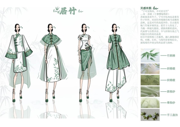 作品灵感来源:“宁可食无肉,不可居无竹”(宋·苏轼《于潜僧绿筠轩》),自古以来文人都将竹当作一种超凡脱俗、清新高雅的意象,代表着与自然共存,不与世俗污浊之气同流合污的高洁品质。作品结合中国传统工艺版型,融入旗袍领结构、对襟、右衽,同时与现代穿着相结合,展现现代中国女性的品质与韵味。