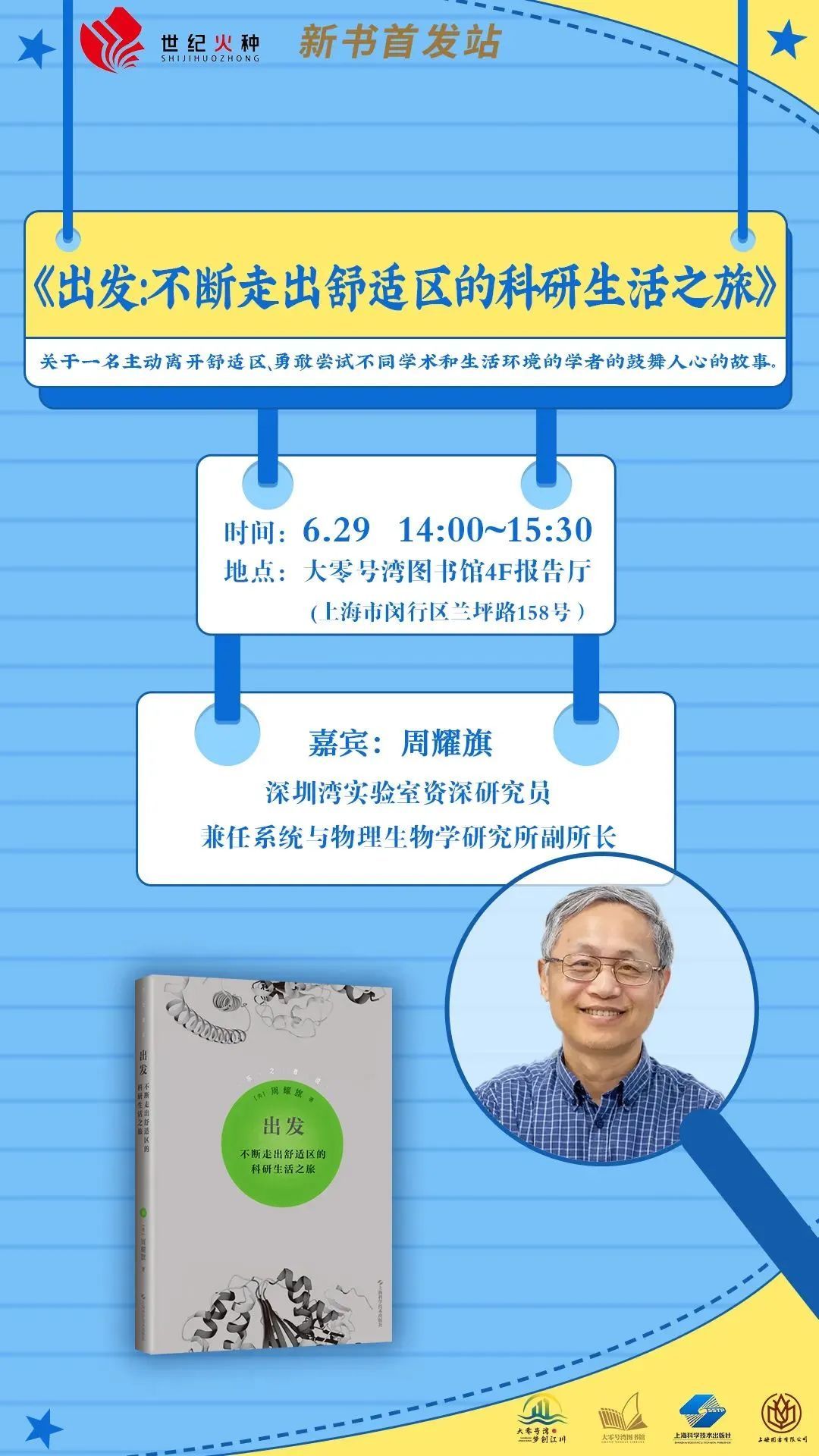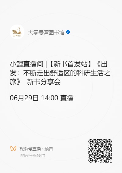 6月29日,我们将邀请深圳湾实验室系统与物理生物学研究所副所长、资深研究员周耀旗来到大零号湾图书馆,带来《出发:不断走出舒适区的科研生活之旅》新书分享会,周老师将通过这本书,向我们分享他的人生故事以及他在家庭生活和子女教育中的心得与体会。