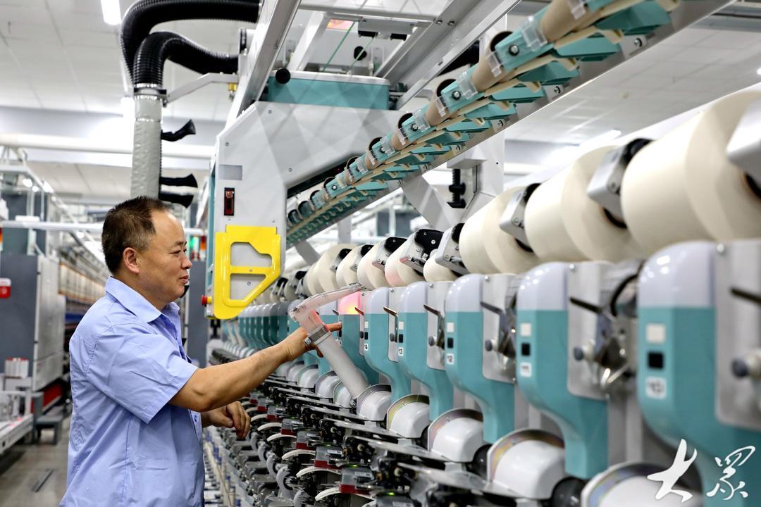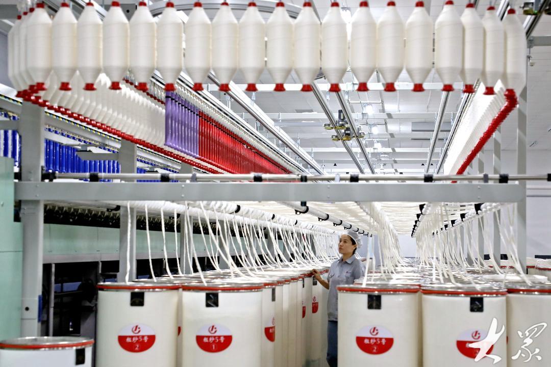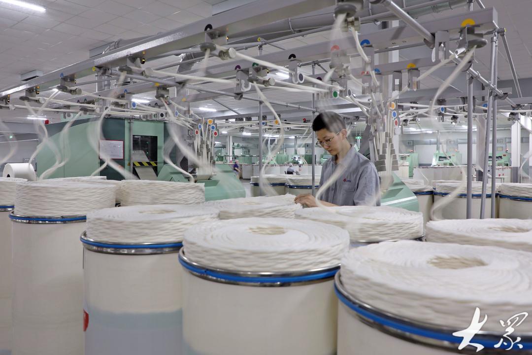 6月28日,在青岛市即墨区龙山街道一家智能纺纱企业,工人在生产高端纤维产品,满足市场需求。