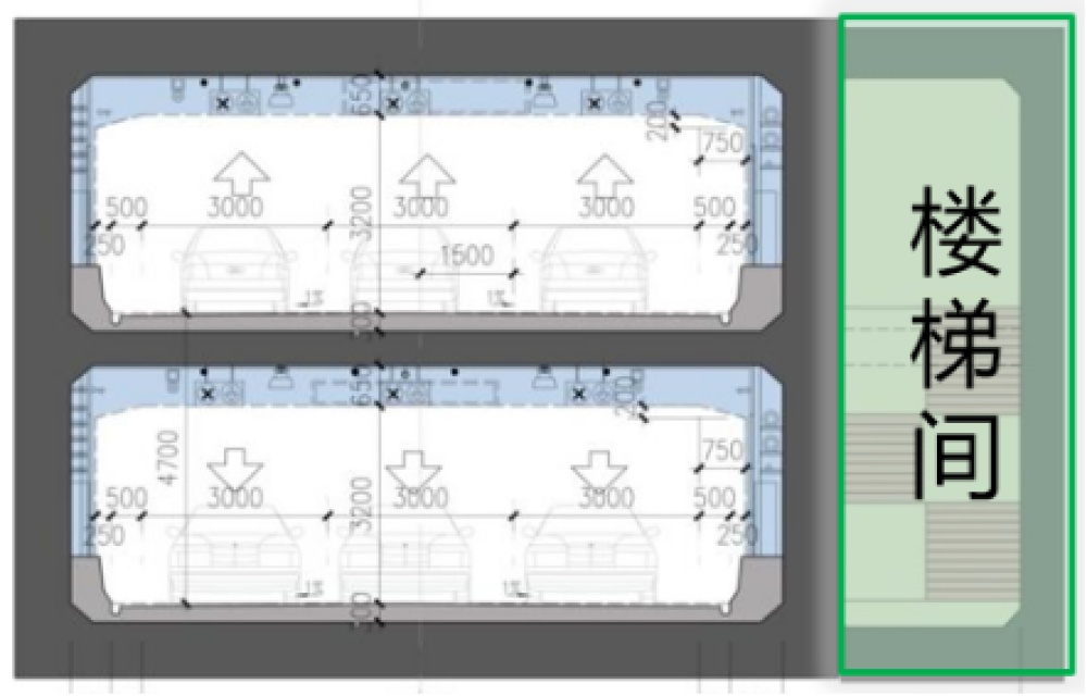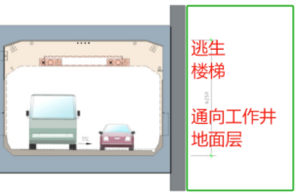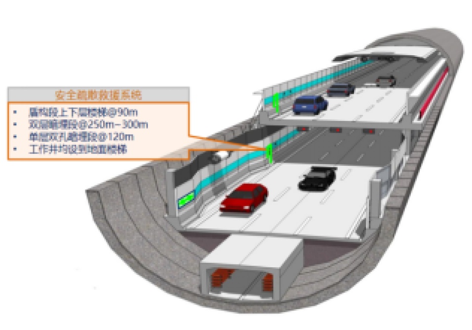 隧道中部(盾构段),一般通过上下层逃生楼梯疏散,逃至对向车行通道。