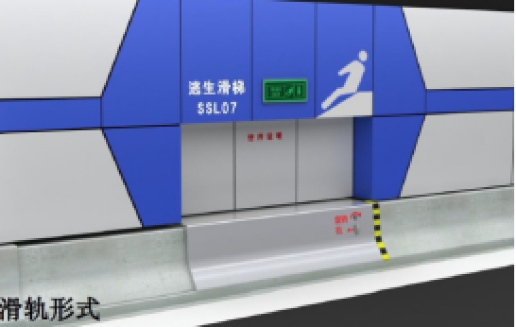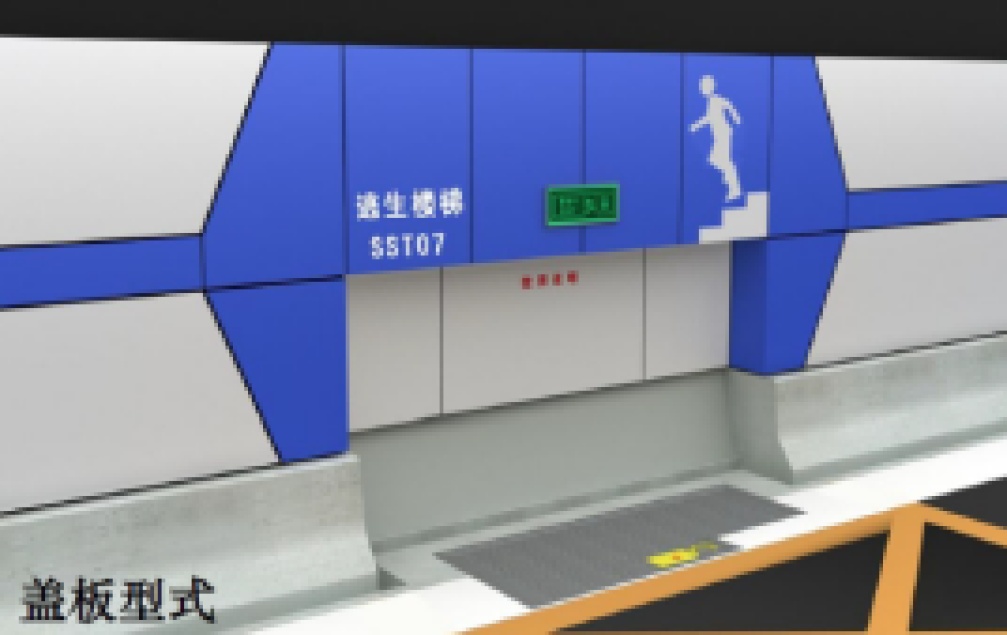 应急疏散人员到达车道侧的应急疏散口,按照指示旋转逃生盖板旋钮打开盖板,双手扶紧滑梯侧壁滑下,到达逃生通道按照安全疏散指示灯逃生到达工作井,完成应急逃生。