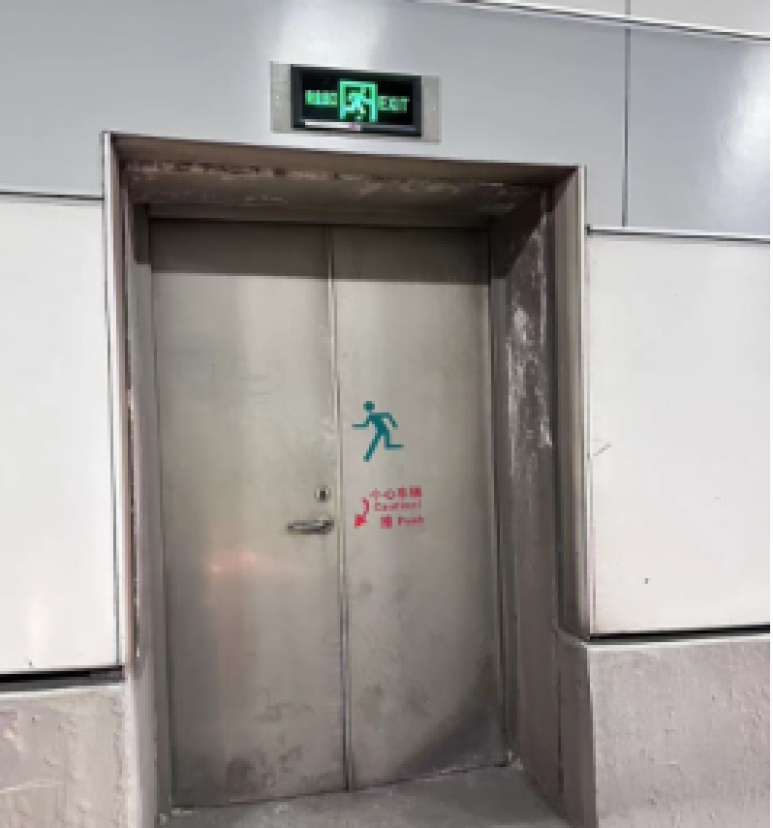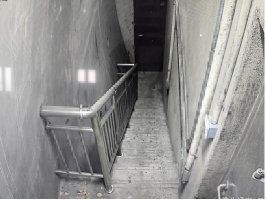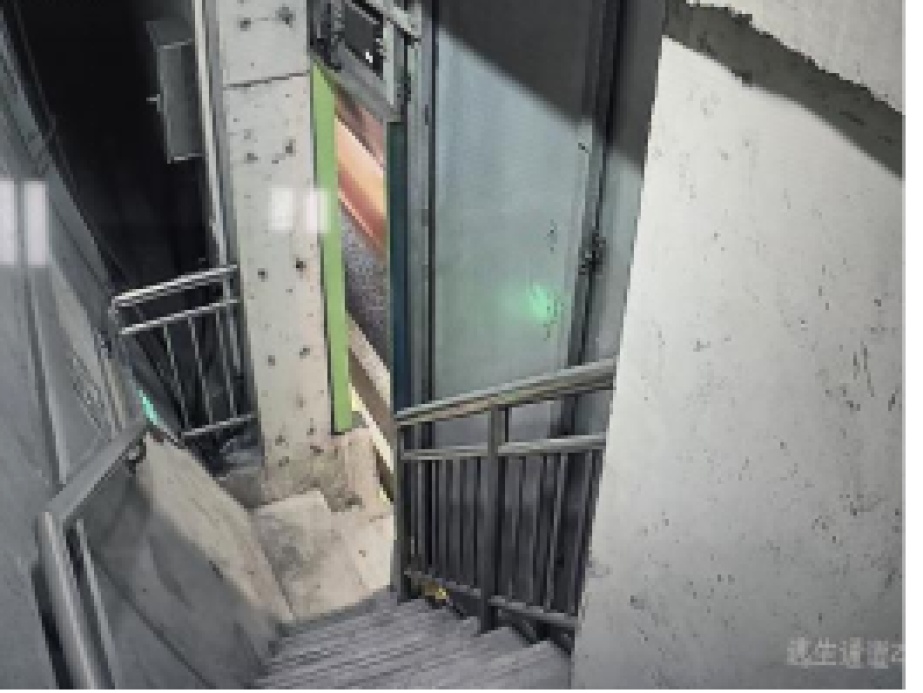 隧道进出口两侧(暗埋段),结构形式复杂,根据现场逃生疏散指示,通过逃生楼梯上下层疏散,或逃生门横向疏散,或逃生通道向工作井逃生至地面,同时隧道进出口兼作人员疏散出口。