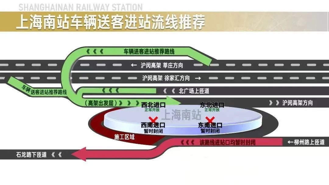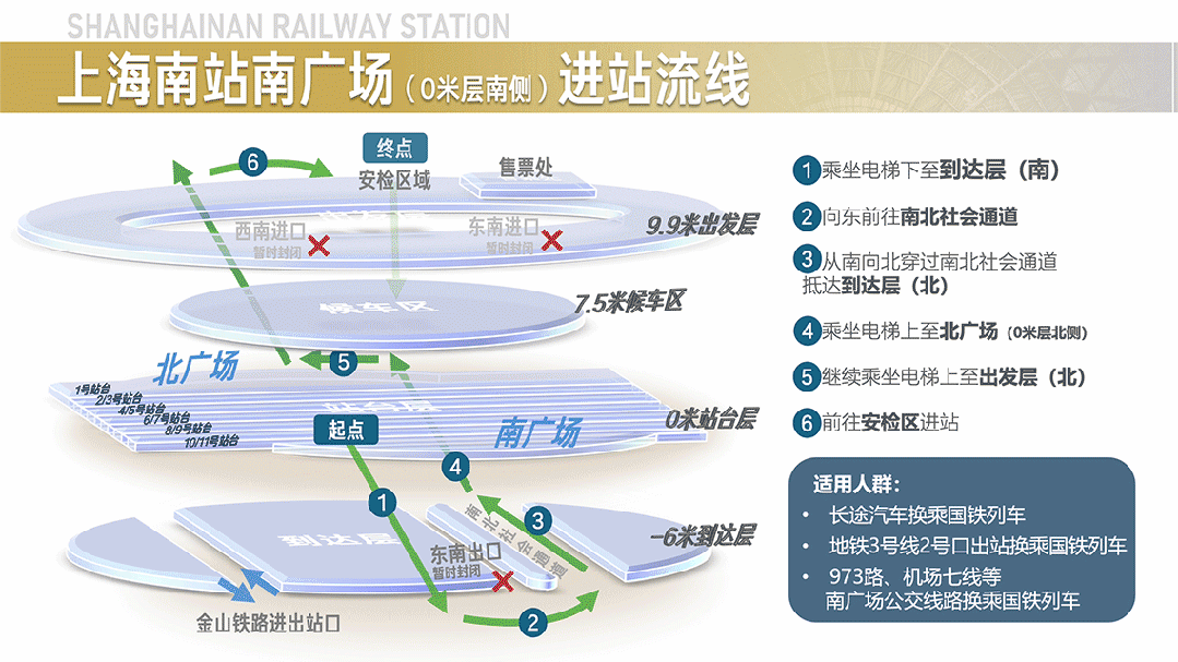 改造期间,上海南站将不断优化引导标识,增派志愿者和工作人员,提供咨询、引导、安全提醒等服务。请广大旅客在进出站过程中,多关注车站张贴的标识和公告,按照引导标识和现场工作人员指引进出站。购买上海南站车票的旅客,请适当提早出门,以免耽误行程。