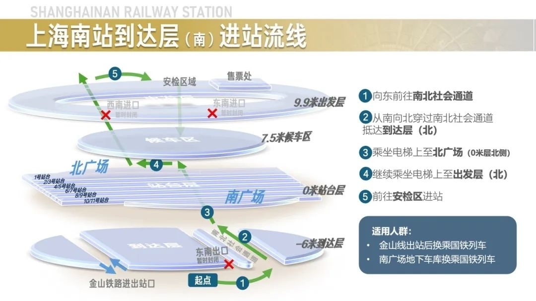 铁路上海站介绍,上海南站设施更新改造工程7月1日起正式启动。提醒大家:除了金山线,请从北面进上海南站坐车。这份进站流线示意图快来看看吧~ (点击图片,查看大图)