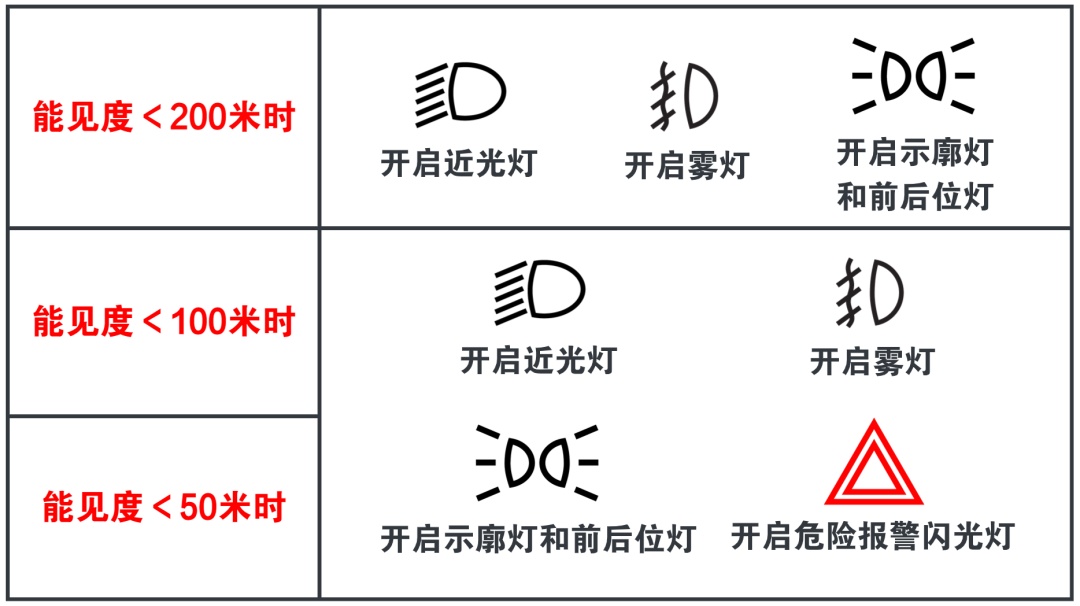 2️⃣能见度小于100米时,开启雾灯、近光灯、示廓灯、前后位灯和危险报警闪光灯,车速不得超过每小时40公里,与同车道前车保持50米以上的距离。
