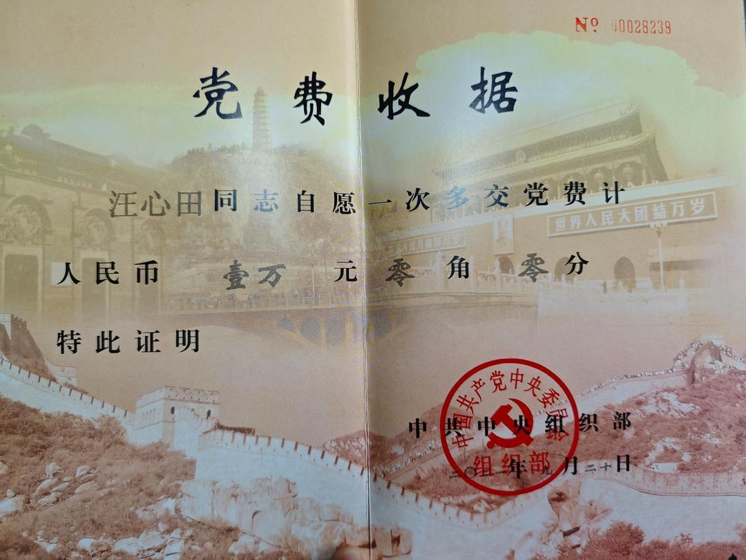 只要是国家倡导的事,他都会力所能及地去做;只要是群众需要的事,他都会全力以赴地去办。抗洪救灾、汶川地震、玉树地震……每一次,他都第一时间交纳“特殊党费”。厚厚的一叠证书,印证着老人对党、对国家、对人民的赤子之情。汪心田充分发挥一名老党员的所学所知,用行动弘扬社会主义核心价值观。他深入学校、田间地头作革命传统报告30多场次,受教育人数达1万多人次。