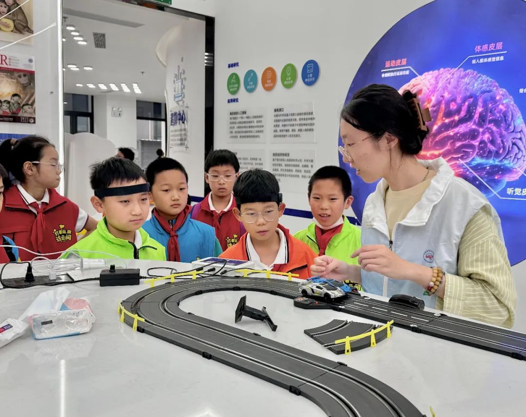“哇,真的跑起来了!”“大脑的力量真强大。”在脑力实验环节,少先队员们头戴脑电传感接收器,屏息凝神用脑力“发电”,伴随着阵阵惊叹声,一辆辆模型小车在轨道上跑动不停。据工作人员介绍,脑电转化设备能够将脑电波信号转换为微弱电流,通过刺激小车底部的接触铜丝,让“意念控制”成为现实。