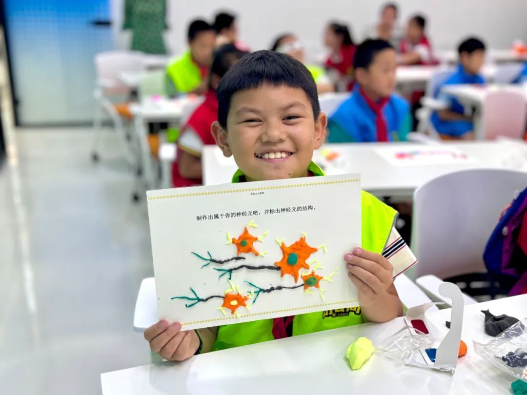 而在脑智科学课堂,带教老师以大脑结构为切入点,带领少先队员们通过显微镜探秘大脑神经网络,观察细胞体、树突、轴突等神经元的基本结构,并鼓励孩子们用各色黏土绘制出自己眼中的多彩神经元。“今天让我第一次看到,感受到了脑电波和神经元的存在,大脑真是太神奇了。”少先队员张倪铭感叹道。