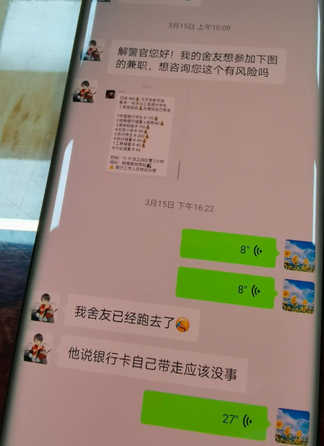 今年3月,小安的室友听信了兼职的小广告,准备按照对方指示去银行办卡。小安越想越不对,第一时间想到了解志凌,询问他是否有风险。根据小安提供的广告信息,解志凌基本判断这兼职有异常。但此时,小安的室友已经在去银行的路上。