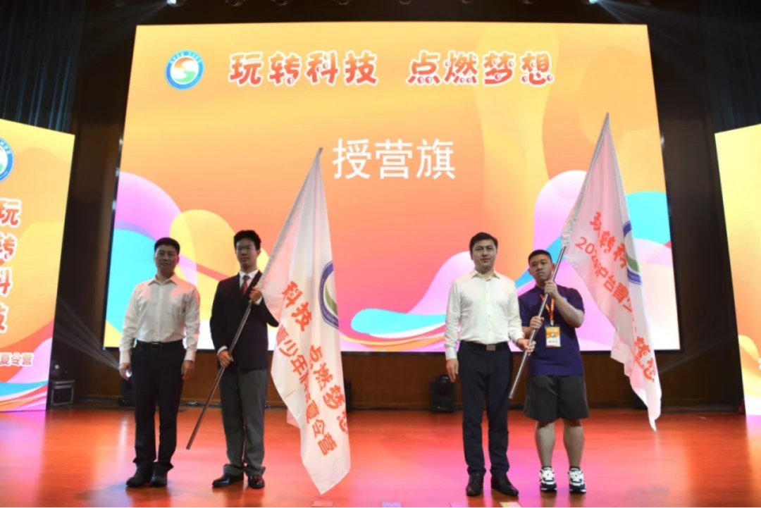 向两地师生代表授营旗。