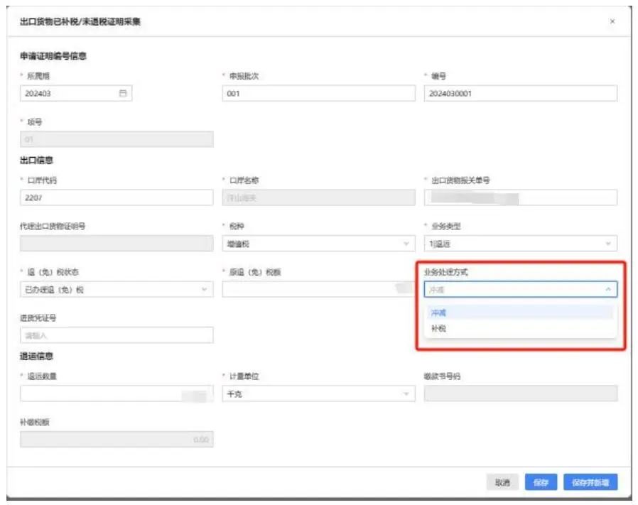 如该出口货物报关单已办理退(免)税,则需填写原退(免)税额、业务处理方式、进货凭证号等信息,业务处理方式为“冲减”或“补税”。