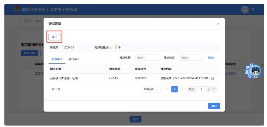 点击【自检查询】按钮,弹出“疑点详情”页面。可点击“警告类”“错误类”切换页面。点击“导出”可将疑点信息导出成Excel文档。