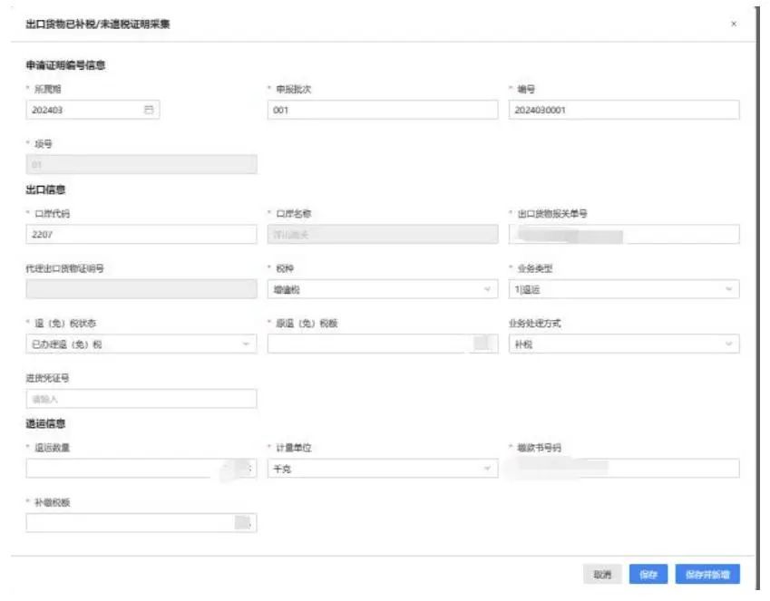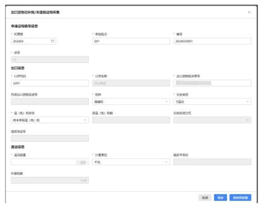 点击【新增】按钮,弹出“出口货物已补税/未退税证明采集”页面,可根据系统提示录入相关信息,进行申请信息采集。