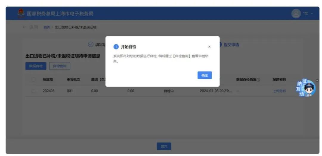 点击【数据自检】按钮,提示开始自检,稍后通过【自检查询】查看自检情况。