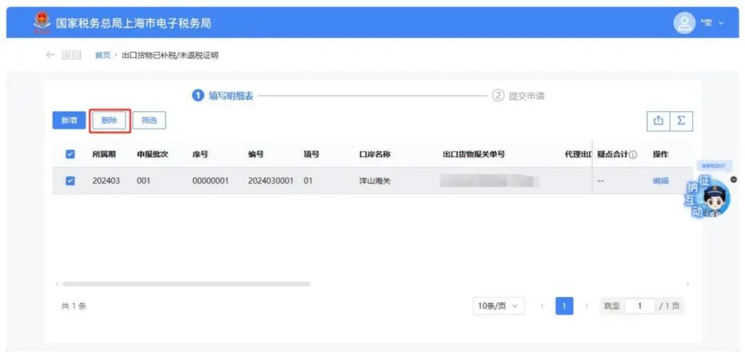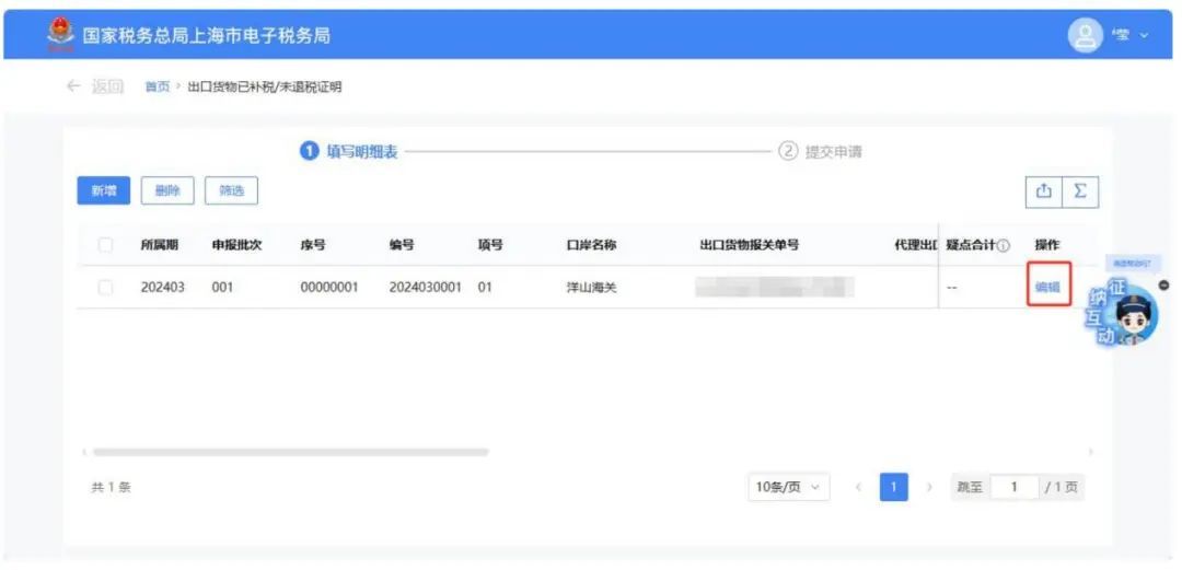需要修改信息时,点击明细数据对应的【编辑】按钮,弹出“出口货物已补税/未退税证明编辑”页面,可对已采集的数据进行修改。