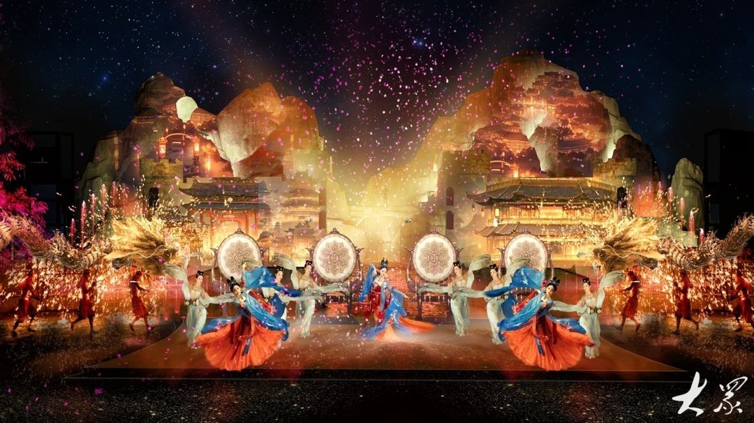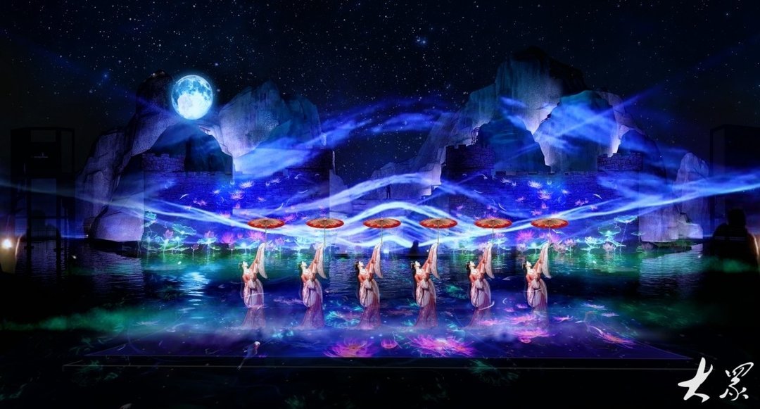 国内罕见高23米的巨大舞美造景,山体气势磅礴,70米宽的壮阔视野,给人带来震撼的视觉冲击;14米高空威亚穿梭其中,结合水特效的柔美与力量,演绎出一幕幕惊心动魄的场景。现场300台灯光、近千台特效设备,水幕电影、火秀特效、音乐数控喷泉、激光表演、无人机表演等科技手段,将“人、声、光、水、电、影、景”完美融合。这场“梦回西楼”大秀由国内顶级编创团队倾力打造,历经了上百次的剧本打磨,将带给观众一场视觉、听觉和情感的盛宴,让观众在感受传统文化魅力的同时,体验现代科技带来的惊艳。