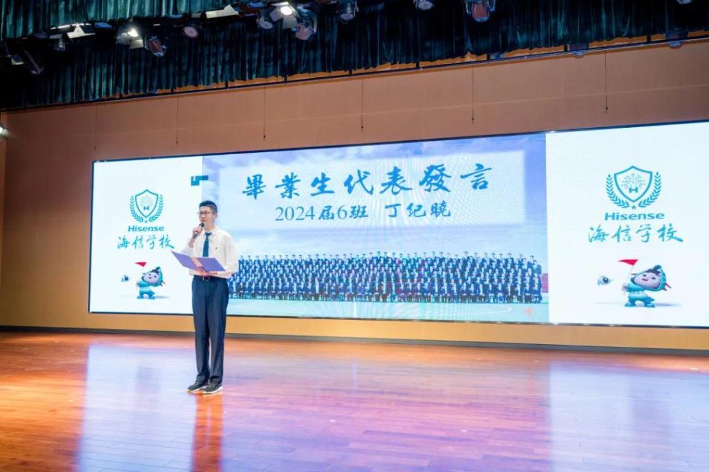 海信学校总校长马林代表海信学校向2024届全体毕业生表示热烈的祝贺,向辛勤哺育海信学子成长的父母、向无私引领学生成才的老师,表示衷心的感谢。并向海信学子提出:要做诚实正直、心中有爱的“海信人”;要做追求卓越、勇于进取的“海信人”;要做坚守责任、敢于担当的“海信人”;要做豁达乐观、热爱生活的“海信人”。祝福每个海信学子筑梦成真,前程似锦,努力成为可堪大用、能担重任的栋梁之才。