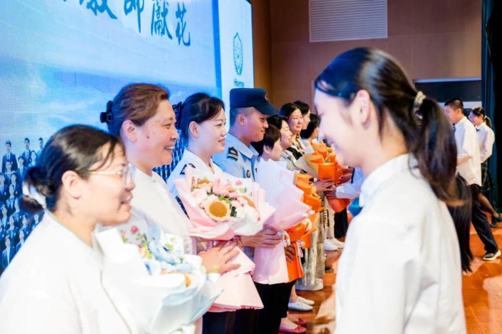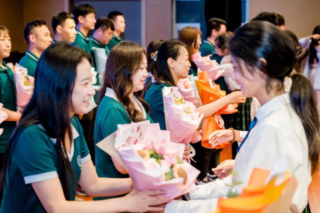 毕业生代表们满怀感激之情,向那些默默辛勤耕耘、无私奉献的老师们以及学校工作人员献上了美丽的鲜花和热烈的掌声。这不仅仅是一束束鲜花的传递,更是一份份感激之情的表达;这不仅仅是一阵阵掌声的响起,更是对老师们辛勤付出的敬意与美好祝福的传递。看着这些曾经稚嫩的孩子已经成长为优秀的青年,老师们眼中不禁闪烁起了感动的泪光。他们为这些孩子们的成长和进步感到由衷的骄傲和欣慰,仿佛看到了无限的希望和未来。