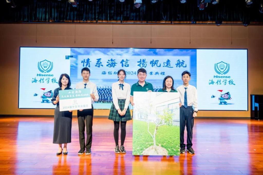 海信集团董事、高级副总裁陈彩霞,海信学校总校长马林代表学校接受毕业生礼物。即将毕业的学生们向学校献上了一份极具意义的特殊礼物——他们在校园内栽种了一棵充满生机的桃树。这棵桃树将成为校园内一道独特的风景线,它的茁壮成长将与学生的青春回忆紧密相连,见证着他们一路走来的点点滴滴。每当春暖花开之时,这棵桃树都将绽放出绚烂的花朵,仿佛在诉说着学生们曾经的奋斗与拼搏。它承载着学生们对未来的美好祝愿,以及对母校的深深祝福。相信在未来的日子里,这棵桃树将伴随着一代又一代的学子,见证他们不断成长,书写属于他们的辉煌篇章。