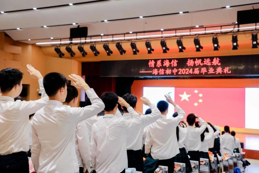 当报告厅内熟悉的上课铃声悠扬响起,学生们齐声唱响国歌。这一刻,不仅表达了对国旗的崇高敬意,更是即将告别母校、踏上新征程的海信学子们对初中生涯的深情告别。这一刻,报告厅内的国歌声愈发激昂,学子们的心中也愈发坚定。让我们共同祝愿这些海信学子们,未来能够砥砺前行,书写属于他们的精彩篇章。