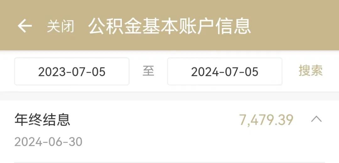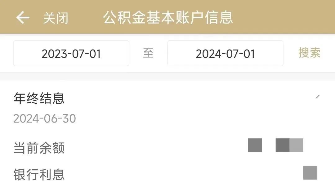 将查询时间段设置为“2023-07-01”至“2024-06-30”,点击查询,即可查看本年度公积金结息具体金额与缴纳明细。