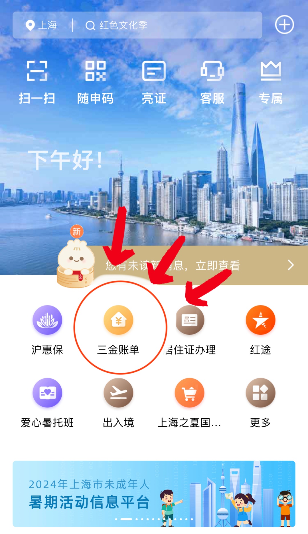 打开“随申办市民云”APP,点击“三金账单”进入服务。