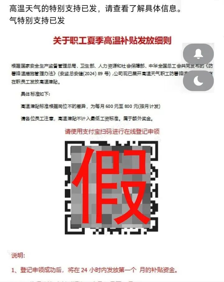 6月24日早上,杭州三墩某公司职员李先生在企业邮箱收到一封公司内部邮件。他点开查看,发现是《关于职工夏季高温补贴发放细则》,并内附在线登记申领二维码。