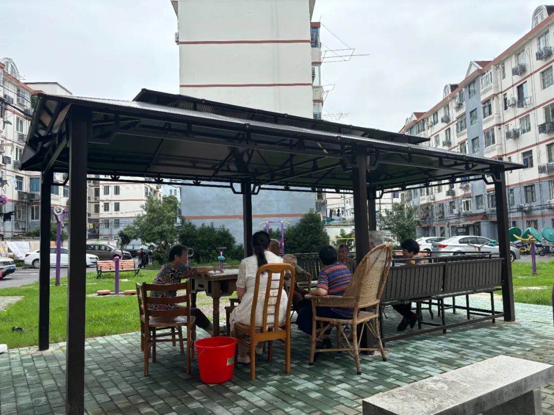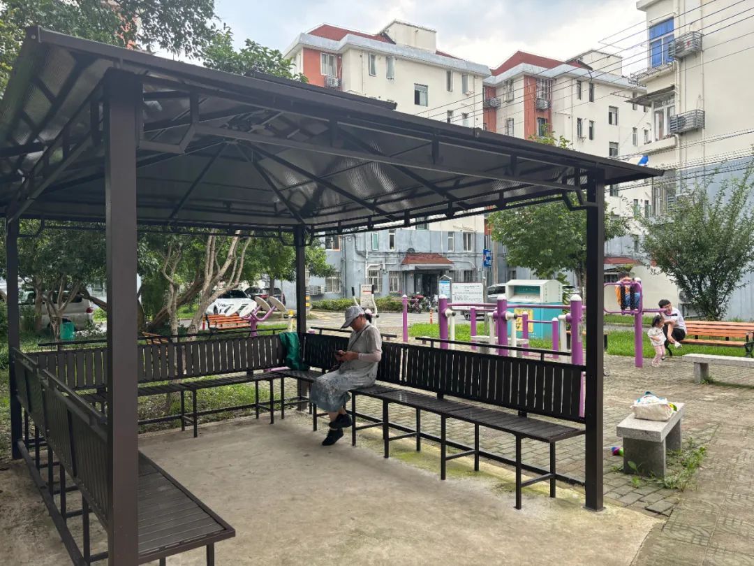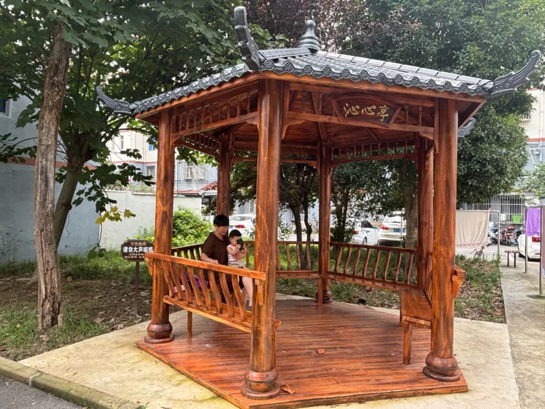 随后一村、三村凉亭建造工作也全面铺开,截至6月中旬,人乐居民区一村、三村、四村的凉亭建造工程全部竣工并投入使用。不同区域的凉亭大小、造型都不同,大的可容纳15余人休憩。居民王阿姨说:“这里住着不少老人,大家平时喜欢在一起聊聊天或者下下棋,之前都是自己搬凳子下楼,有了这个凉亭就方便多了。”