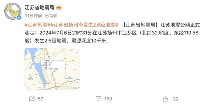 交汇点讯 江苏地震台网正式测定:2024年7月6日21时31分在江苏扬州市江都区(北纬32.61度、东经119.58度)发生2.6级地震,震源深度10千米。