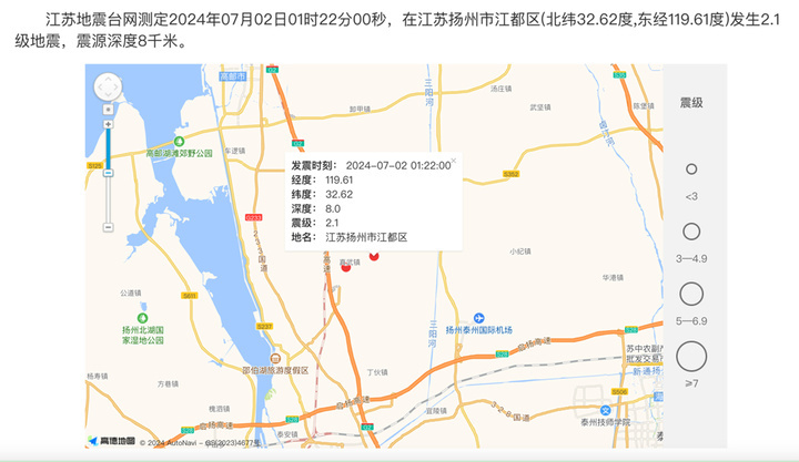 7月2日,扬州市江都区曾发生2.1级地震。