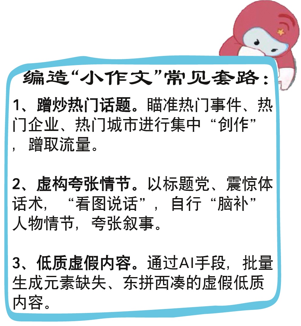 “上海暴雨出现泥石流”“某高校全网封杀热门游戏”?网上信息纷繁复杂,一些“自媒体”总想“投机取巧”,试图通过编造“爆款小作文”来实现“一夜爆红”的效果。殊不知,“小作文”也会惹上“大麻烦”! 近期,上海市委网信办陆续曝光虚假卖惨、炫富拜金、编造“小作文”、扮丑猎奇、标题封面党、低俗擦边、贩卖焦虑、煽动群体矛盾等8类无底线博流量的“自媒体”套路和案例。 案例1 碰瓷热门游戏博流量 “鱼儿游戏汇”(粉丝数4.7万)本是定位游戏资讯分享的游戏“自媒体”,却想着碰瓷热门游戏,走上流量提速的快车道。在未经核实的情况下,仅凭网上零散信息,便臆测称某知名游戏公司“疯狂裁员”“某高校封杀了旗下两款游戏”,传播不实信息蹭热度。在上海市委网信办指导下,该游戏公司拿起法律武器,向“鱼儿游戏汇”提起诉讼。最终,该“自媒体”在网上公开道歉,主动清理不实“小作文”。 沪小信提示 遇到热点话题的“小作文”,不如让子弹飞一会,静候官方回应,不信谣不传谣,免得受到法律牵连! 案例2 虚构夸张“讲故事”博流量 “南宫说”(粉丝数3.2万)发布的内容多选取争议或负面词汇,炮制骇人听闻、低俗的浮夸标题、封面党以博眼球。多次杜撰历史名人虚假故事,编造民族英雄、历史人物负面信息以博取流量,传播历史虚无主义和不良价值观。平台已依法依规关闭该账号。 案例3 低质虚假“新闻”博流量 账号“雪中花”近日发布“小作文”,称“上海特大暴雨灾情情况非常严重”。该文重要元素缺失(无具体时间、无信息来源、无现场图片),虽看前面倒无多大问题,可后半段便露出马脚:“部分地区出现山体滑坡、泥石流等险情”,显然和上海地理情况不符合,违反基本常识。经技术分析,该低质虚假文章疑似为AI生成。因多次发布低质内容引流,平台已对该账号进行处置。 沪小信提示 一股浓浓的“GPT味儿”~看似没啥问题,套在其他城市貌似都可以,但一看细节破绽百出。制作者上点心吧,至少符合常识、“核对”下再发呀! 流量套路深,“冲浪”需谨慎。 “沪小信”将持续更新 无底线博流量系列案例和套路 我们下期见啦! 作为今年“清朗浦江”五大专项行动之一,上海市委网信办将持续开展“清朗浦江·e企聚力” 整治“自媒体”无底线博流量专项行动,旨在规范属地“自媒体”及其MCN机构信息发布,压实属地网站平台主体责任,压缩无底线博流量行为空间。 欢迎广大网民据实提供线索,一起聚力,共同维护清朗网络空间! 专项工作联系邮箱 wxbwgc@shxc.gov.cn