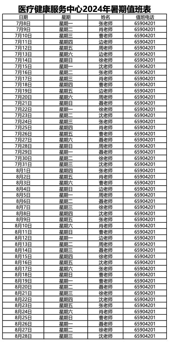 根据学校暑假工作安排,医疗健康服务中心自2024年7月8日至8月28日安排轮岗值班。教职工、学生门诊时间为周一至周五,上午9:00-11:30,下午13:30-16:00。为保障假期在校学生的健康,医中心除门诊时间段以外,安排有24小时急诊值班。