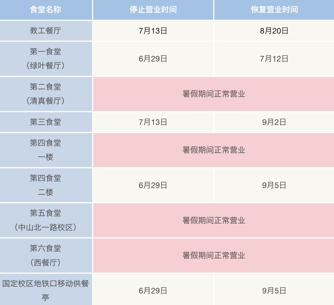 1)女生公寓园区公共浴室:7月8日至8月19日开放时间调整为17:00—23:00,8月20日起正常开放;