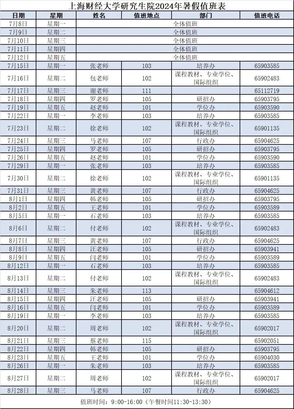 根据学校暑期工作安排,研究生院自2024年7月8日起至8月28日安排轮休,8月29日起正常上班。轮休期间研究生院对外服务时间安排如下:
