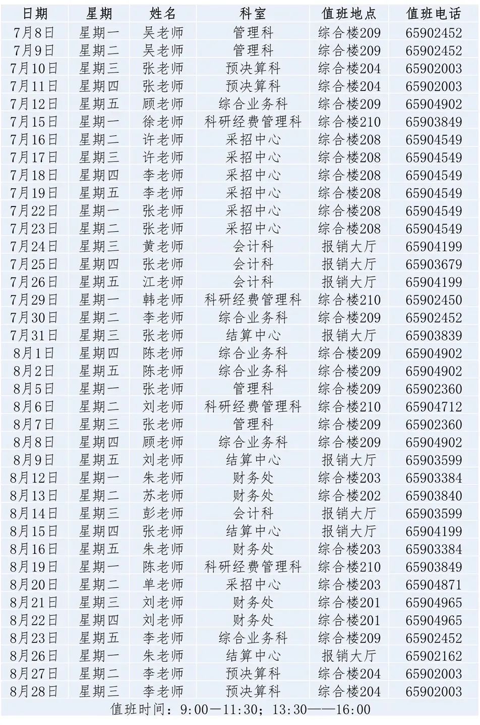 根据学校工作安排,财务处自2024年7月8日起至8月28日安排轮休,8月29日起正常上班。轮休期间财务处对外服务时间安排如下: