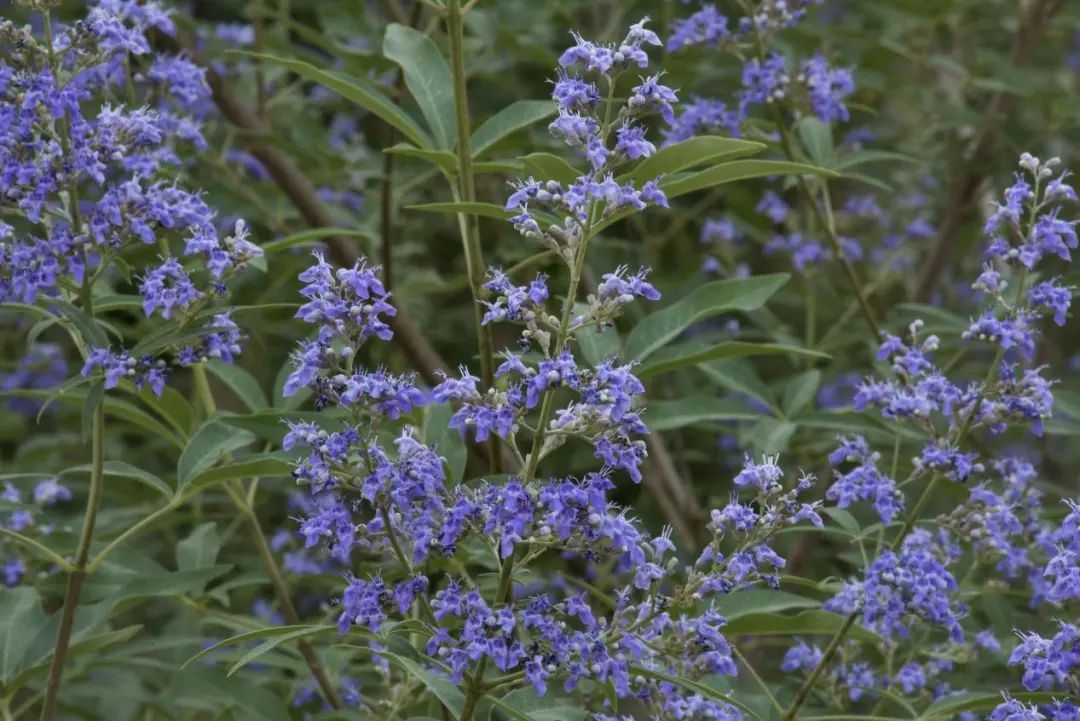 穗花牡荆为唇形科(以前是马鞭草科)牡荆属的落叶灌木,原产于欧洲南部和地中海沿岸。除了观赏,它也是一种药用植物,其果实——成熟后会变为红黑色或黑色,在一些地方被叫作“圣洁莓”——含有多种如黄酮类、三萜类、挥发油等,具有调节内分泌、抗菌消炎、镇静安神、利尿消肿等作用,其提取物制品是治疗女性经前综合症和老年人更年期综合症的特效药。当然,果实也可用于食用,可磨碎后加入茶饮,或干燥后作为香料,也可制作果酱或果汁,用途多多。