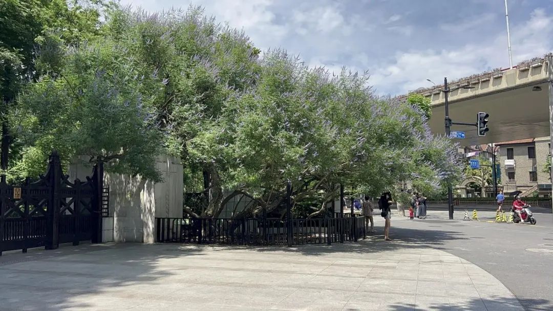 在上海的古树名木中,有一株不那么常见的古树,年过百岁的它如今正在开放,朵朵蓝花从树间涌出,一簇簇幽蓝让观者神清气爽,给夏季带来丝丝清凉。这株古树,就是园艺界的早期网红之一——穗花牡荆。这株年过百岁的穗花牡荆位于复兴公园的大门口,与公园一起度过了百年的风雨,是此时复兴公园最好的名片。