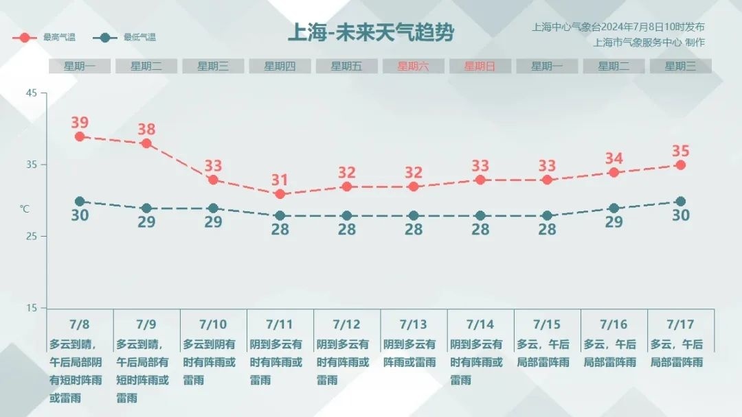 今天(7月8日),晴好高温天气延续。上午8点42分,金山区气象局发布第五个高温橙色预警,受副热带高压影响,我区大部分街镇最高气温超过37℃。周三起,受短波槽影响,我区将有降水过程,高温将有所缓解,提醒市民朋友及时关注临近预报预警,并做好防暑降温工作。 上午9点,阳光明媚、天空湛蓝、白云朵朵,白天最高气温达38℃,“晴、热、晒”依旧是主旋律。东礁公园里,绿树成荫,外出的市民全副武装,遮阳伞、防晒衣、遮阳帽等一应俱全,锻炼、散步的市民也是在阴凉处。 市民 方女士: 今天天气好热,酷热难忍,这几天都是高温天。 市民 李女士: 我每天早上都出来的,今天有风,出汗不是很多。10点钟以后气温就高了,太热了,要早点回家。 记者从气象部门了解到,今天,我区以多云到晴天气为主,午后局部有雷阵雨,全天气温在29℃~38℃之间,明天依旧以晴好天气为主。 但周三起,我区将有一次降水过程,气温回落。在此提醒市民朋友,要及时关注临近预报信息,并做好防暑降温工作。 部分资料来源:上海天气发布 记者丨王佩永 武春辉(实习) 摄影丨金燕玲 编辑 | 俞岚婷 责编 | 陈薇婷 潘婷