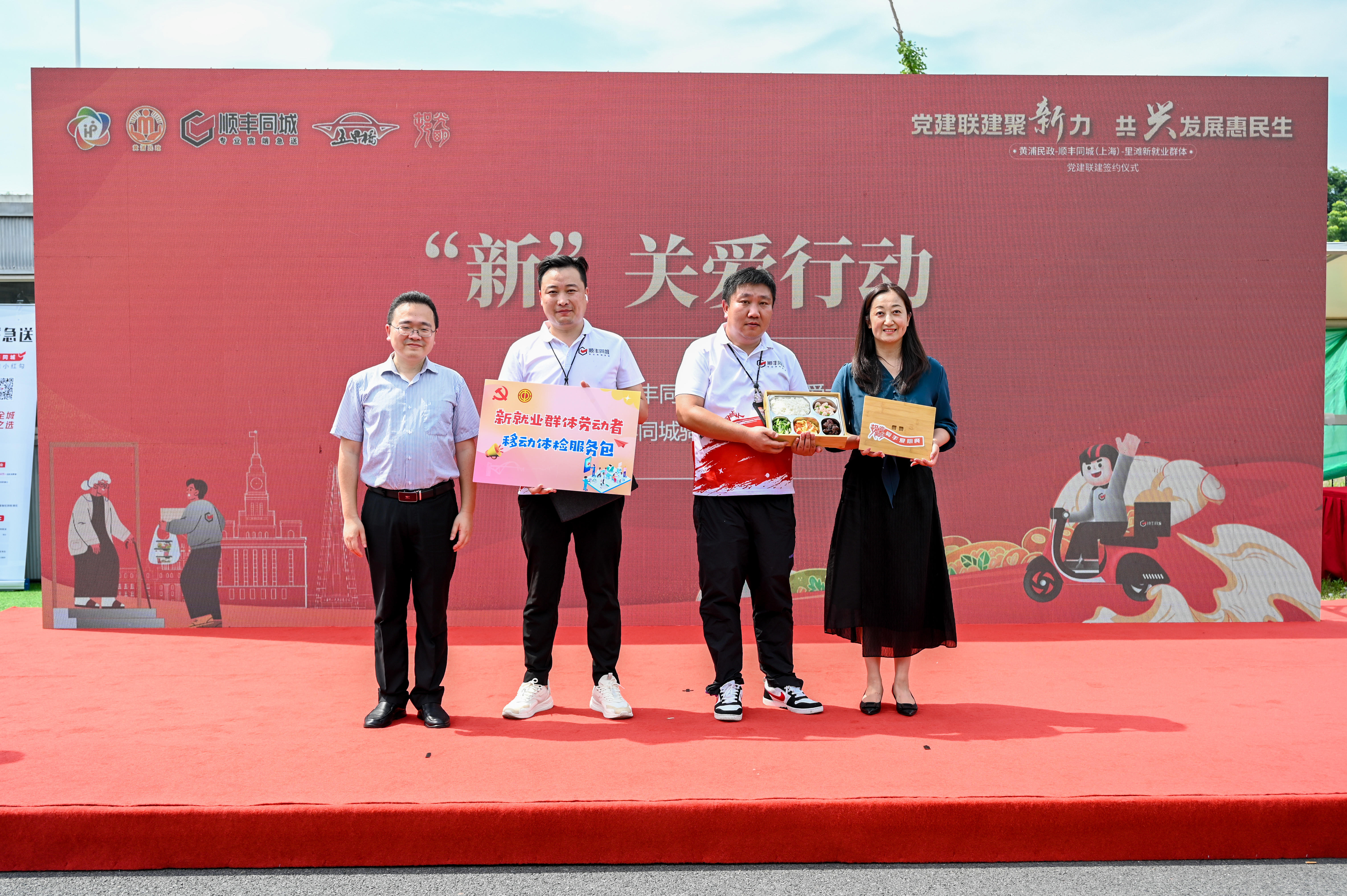 7月8日上午,“党建联建聚新力 共兴发展惠民生”黄浦民政-顺丰同城(上海)-里滩新就业群体党建联建签约仪式在局门路699号乐舜邑园举行,光明邨助老配餐社区“最后100米”标准化配送项目正式启动,今后,有送餐到家需求的老年人可以通过黄浦区“五边颐养”小程序,选择“一键助餐”服务,线上下单完成支付,顺丰同城专业骑手高效安全配送到家,让黄浦老人在家就能便捷享受送餐到家服务。